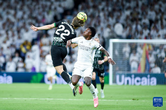 3月14日,皇家马德里队球员维尼修斯(右)和埃尔切队球员阿芬克鲁伯争顶。